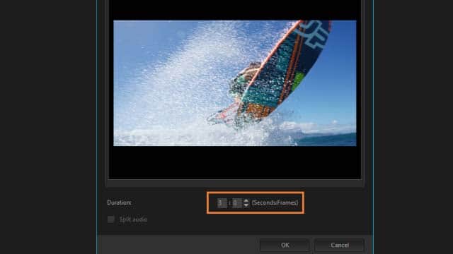 In the Freeze Frame dialog box, set the Duration you want to make this. Note: If you want to suspend audio on other tracks during the freeze, enable the Split Audio check box. This splits and suspends all audio-related tracks (voice, music, video overlays) for the duration of the video freeze.